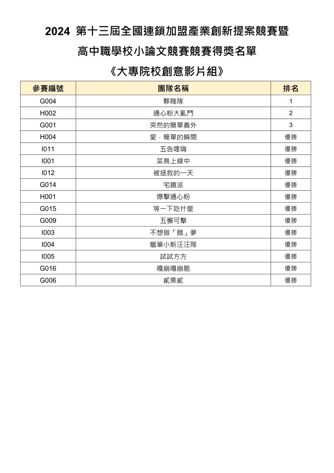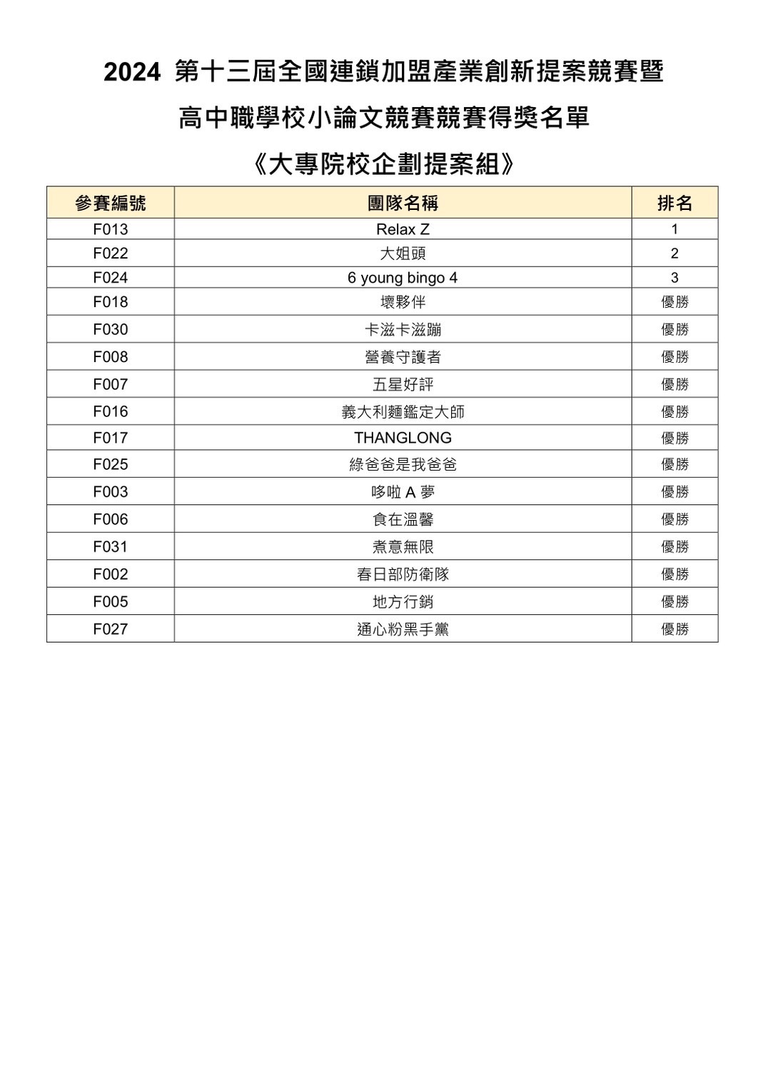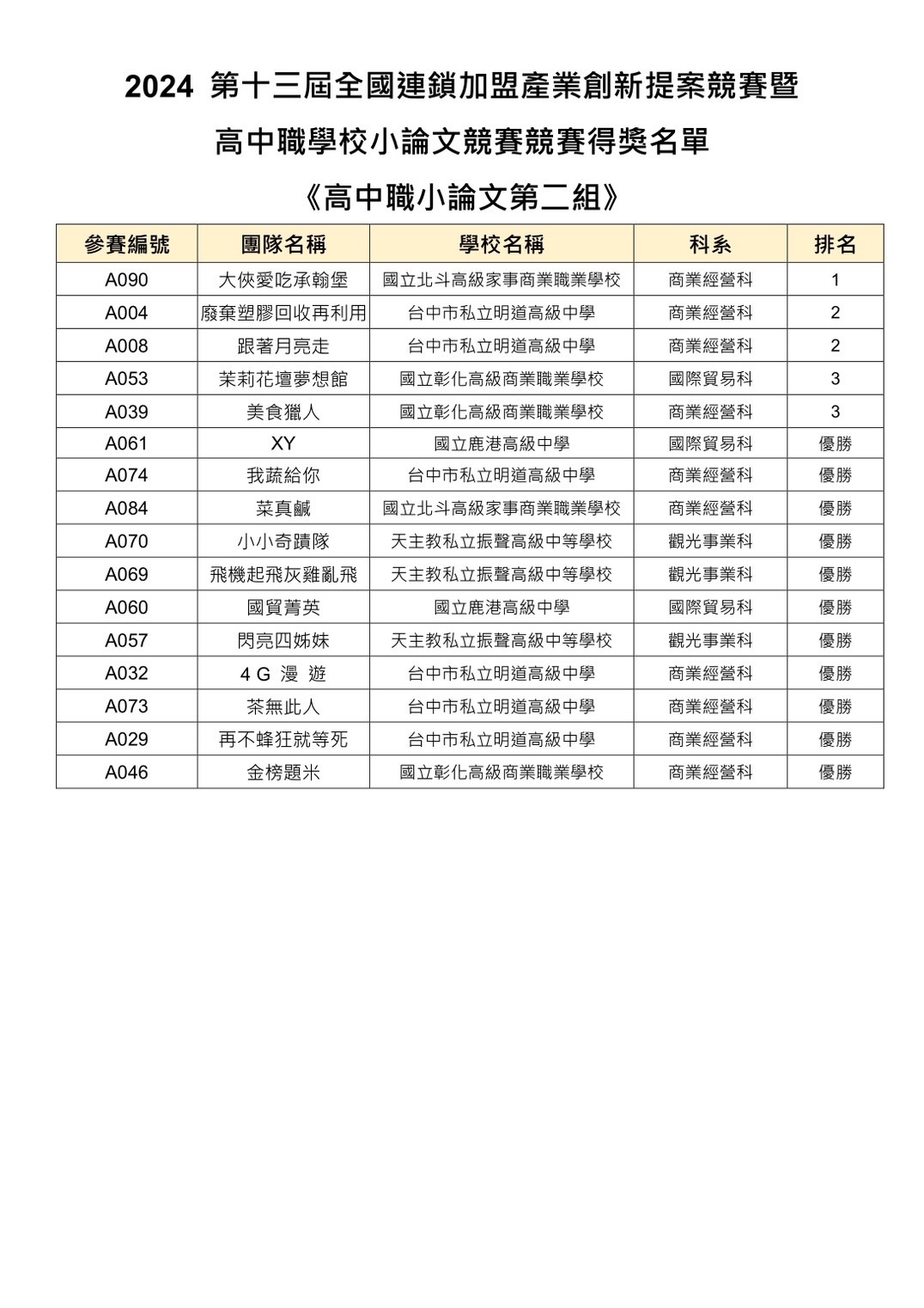 【競賽】『2024第十三屆全國連鎖加盟產業創新提案競賽暨高中職學校小論文競賽』競賽得獎名單公布