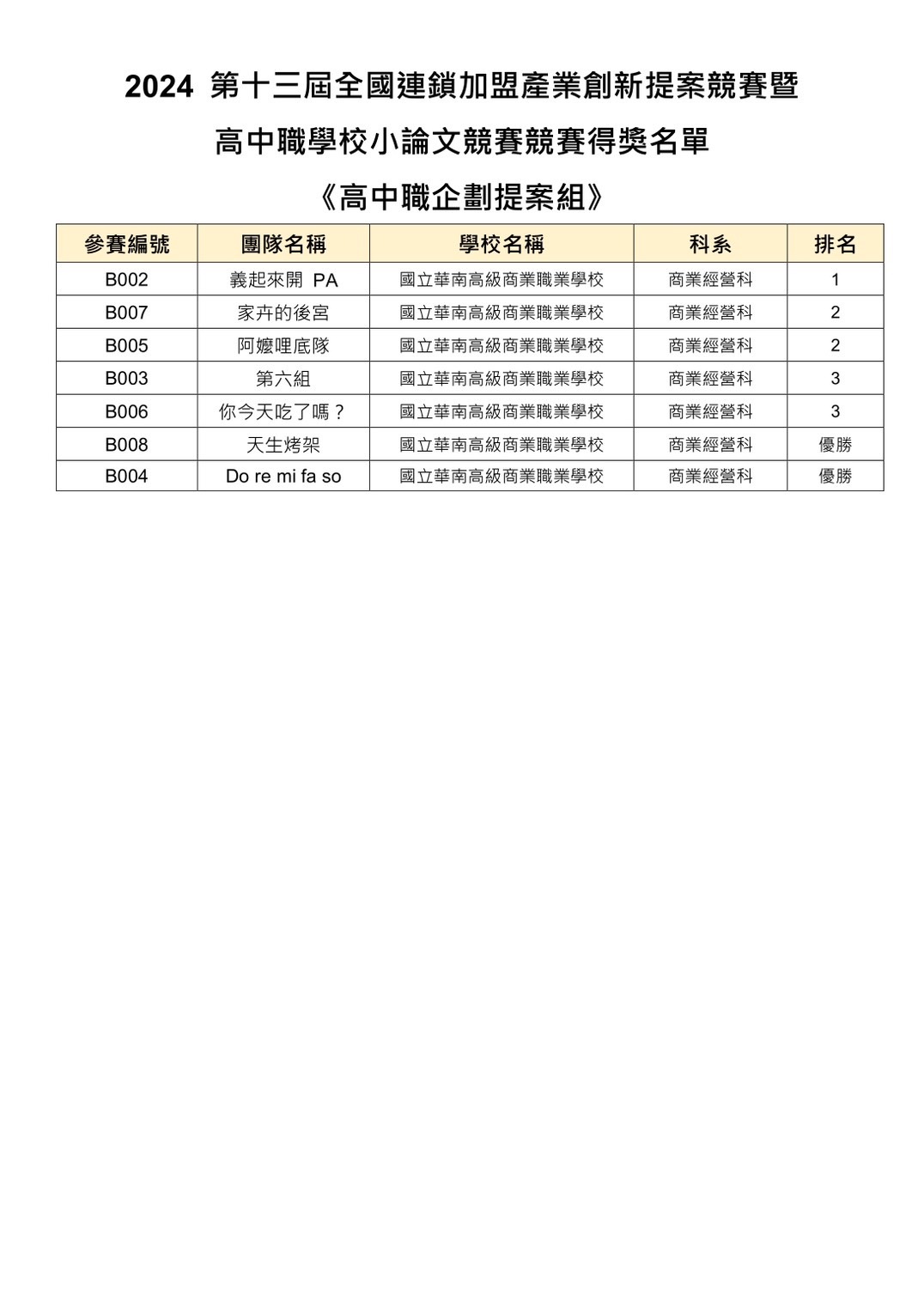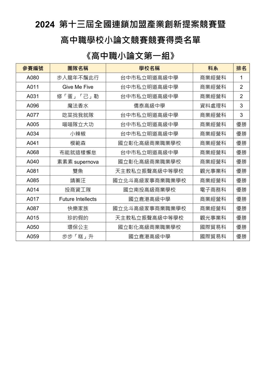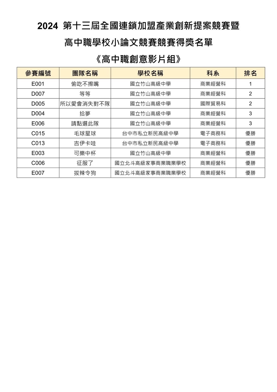 【競賽】『2024第十三屆全國連鎖加盟產業創新提案競賽暨高中職學校小論文競賽』競賽得獎名單公布