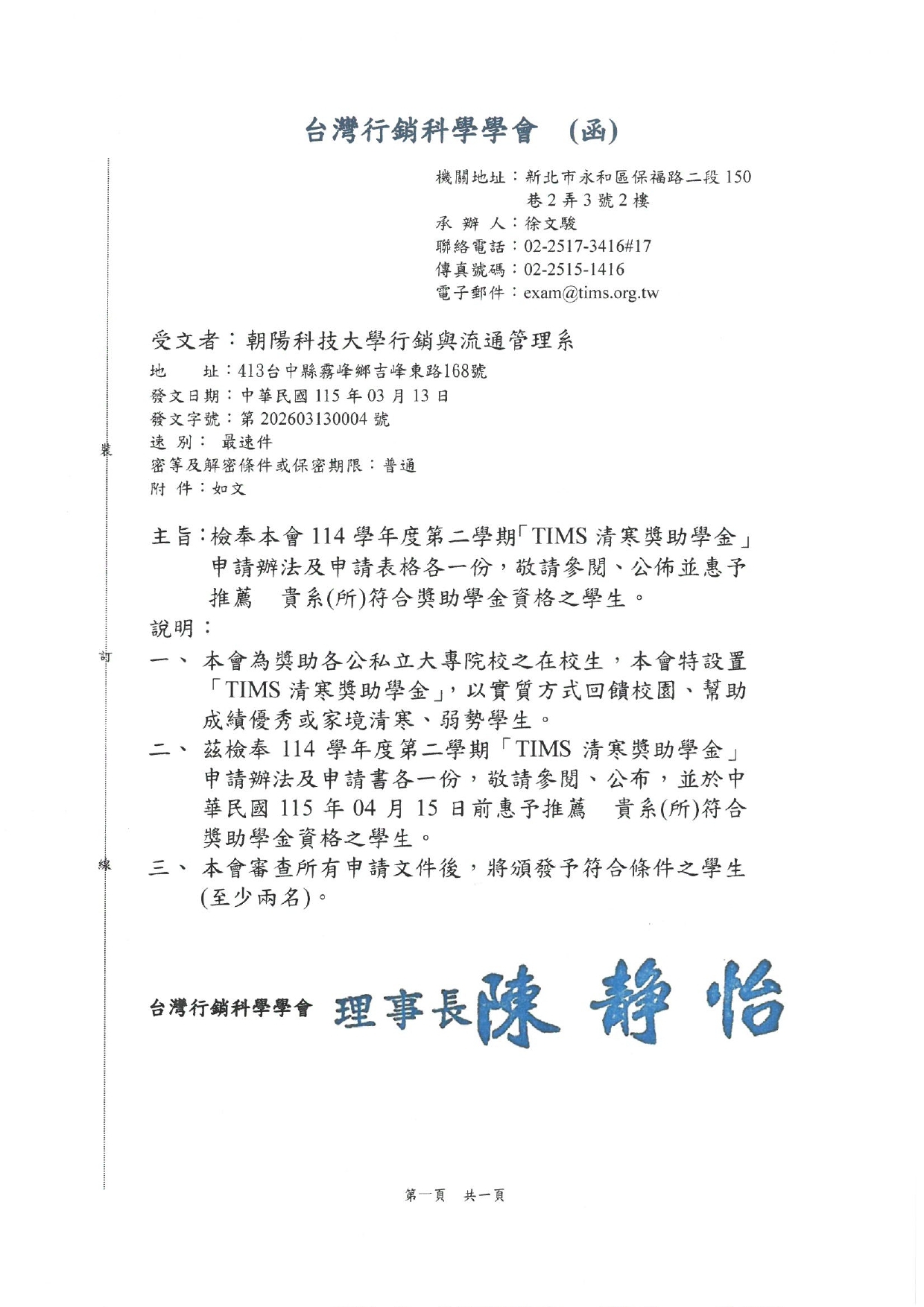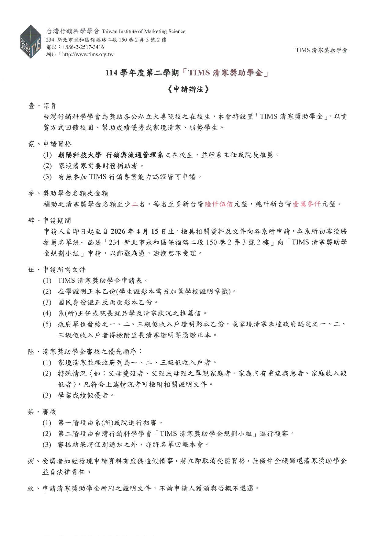 【獎學金】TIMS清寒獎學金 只到4/2喔~